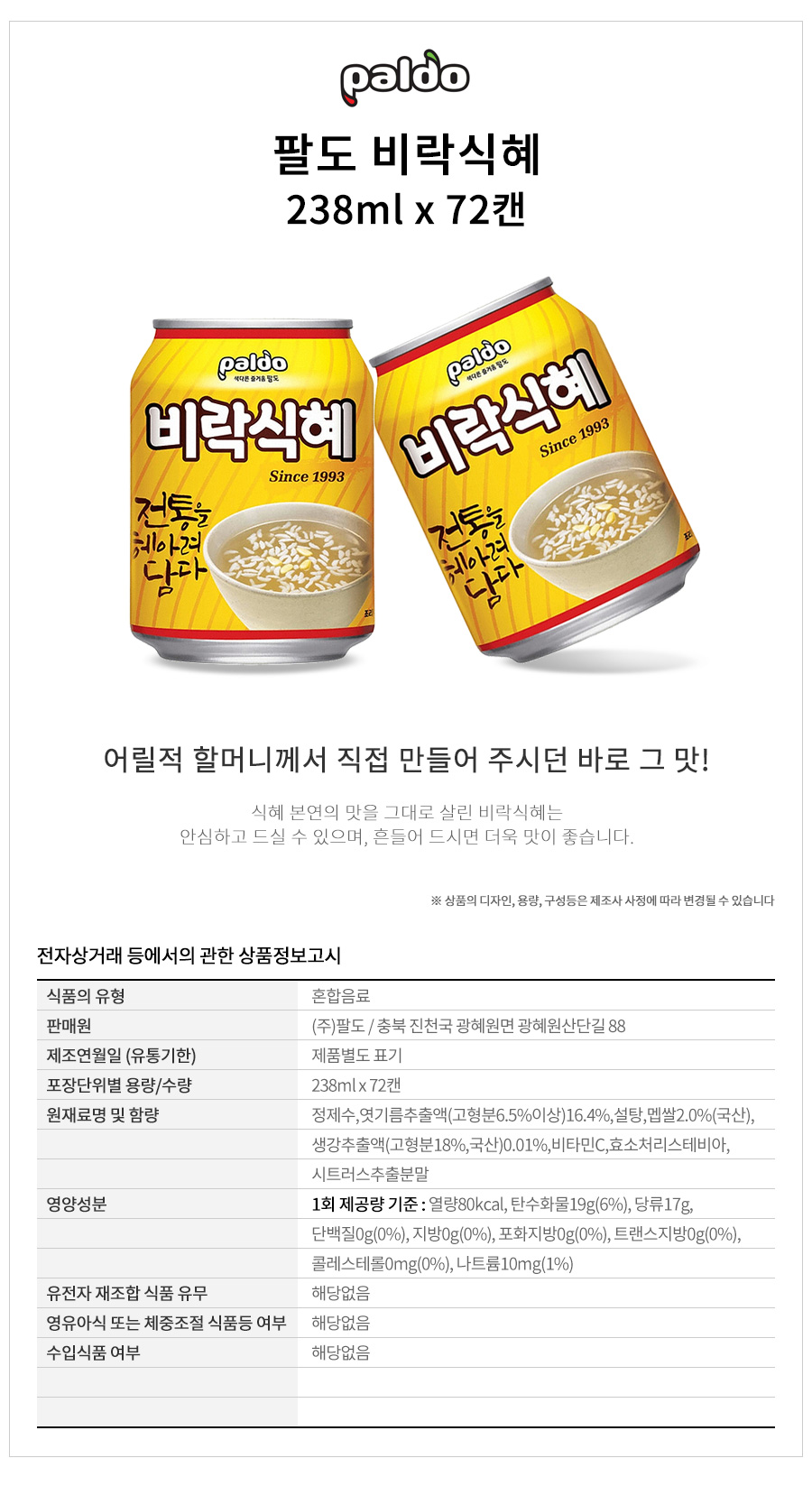 | Æ÷Àå´ÜÀ§º° ³»¿ë¹°ÀÇ ¿ë·®(Áß·®), ¼ö·® | 238ml x 72ĵ |